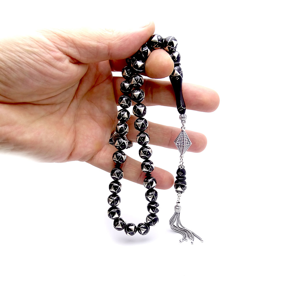 Gümüş Üçgen İşlemeli Gümüş Kamçılı Kuka Tesbih