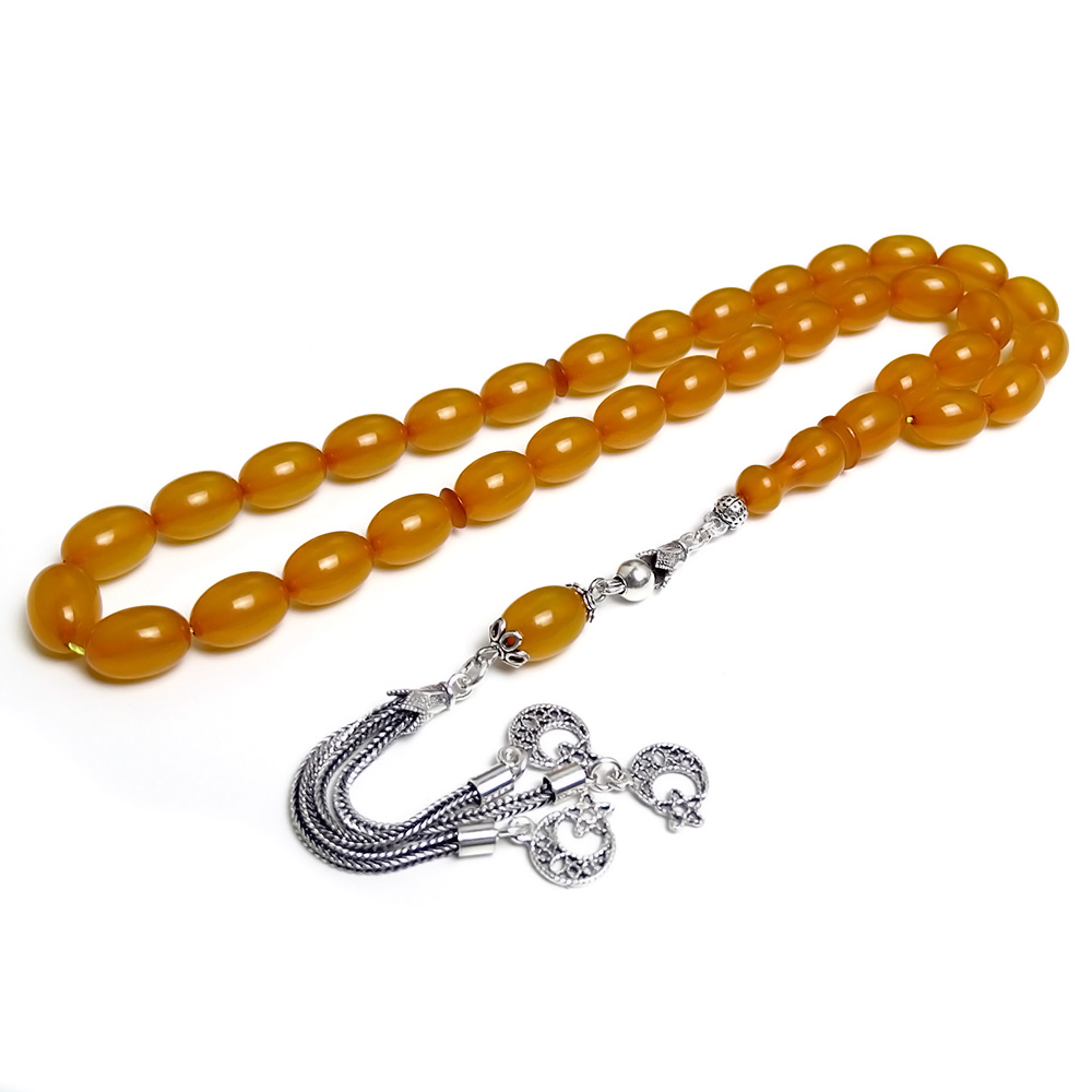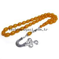 Sarı Renk Gümüş Püsküllü Sıkma Kehribar Tesbih