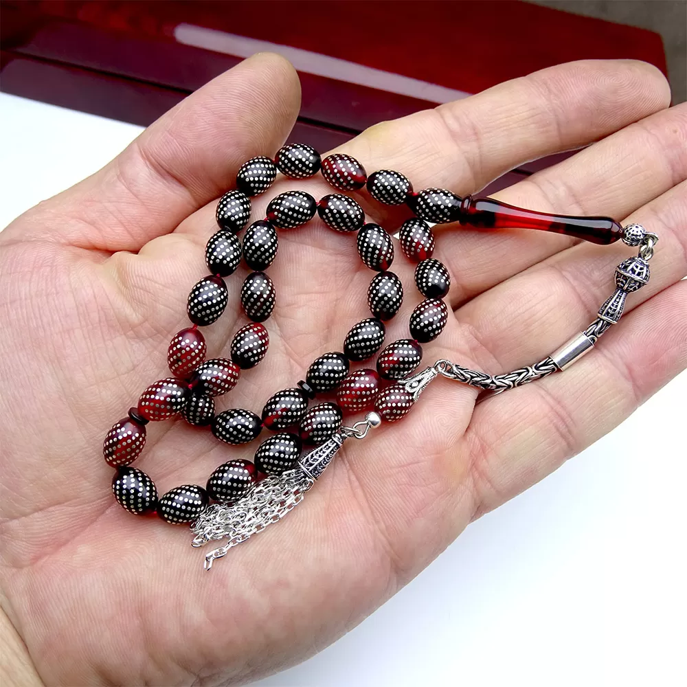 Gümüş Nokta Çeşmi İşlemeli Ateş Kehribar Tesbih